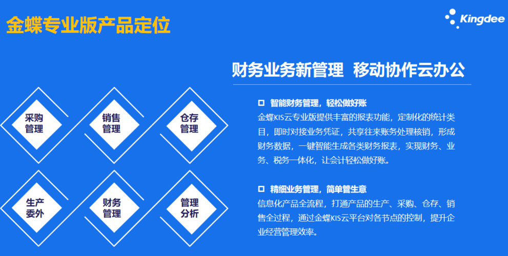 金蝶KIS是小型企業以低成本、高效率、快速入門的方式實現管理信息化的解決方案。金蝶KIS以“讓管理更簡單”爲核心設計理念,适用于小型企業。金蝶KIS旨在提高管理能力、完善規範業務流程,全面覆蓋小型企業管理的五大關鍵環節:老闆查詢、财務管理、采購管理、銷售管理、倉存管理。